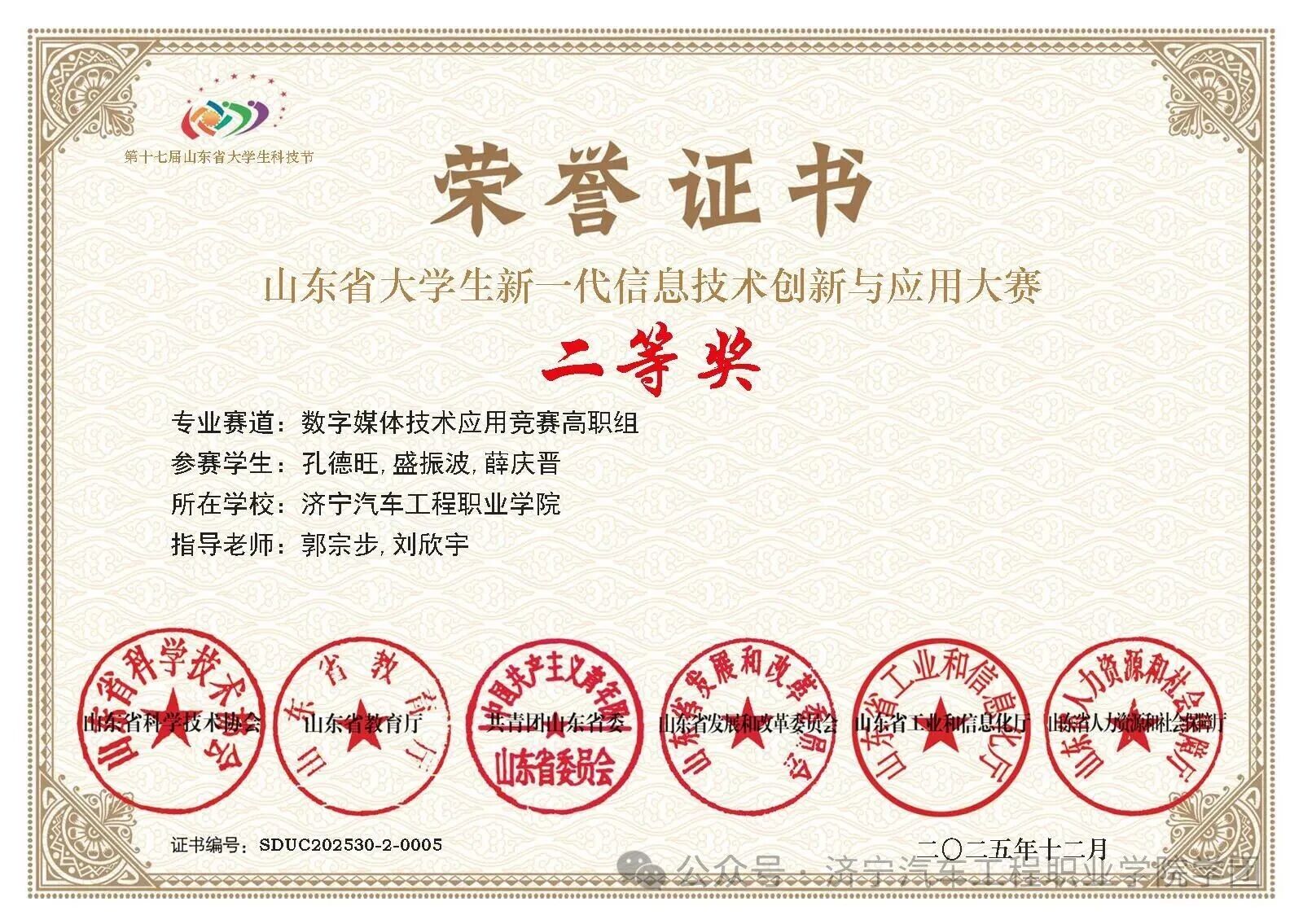 第十七届山东省大学生科技节——山东省大学生新一代信息技术创新与应用大赛以“以科技创新星星之火,点亮青春逐梦路”为主题,于2025年7月正式启动,全省一百余所高校的一千余支队伍汇聚于赛场,展开了一场高水平的科技创意比拼。我校人工智能系学子凭借扎实的专业基础和创新实践能力,在数字媒体技术应用竞赛高职组中表现优异,荣获二等奖、三等奖,为学校增添了荣誉。